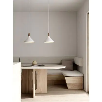 Die Nordlux Pendelleuchte aus der Modellreihe Nori zeichnet sich durch ein modernes Design und einen schicken Materialmix aus. Der Lampenschirm besteht aus Metall. Das Markenzeichen der Modellserie ist die Holzspitze in geöltem Nussbaum. Hinweis: Die Leuchte kommt ohne Leuchtmittel daher - passende E27 LED-Lampen finden Sie jedoch in unserem Shop.