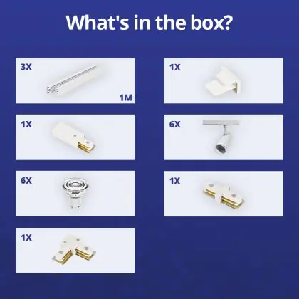 Beschreibung Komplettset 1-Phasen Rail L 1 x 2 Meter Weiß | incl. 6x Spot + GU10 2700K 3W Dimmbar + Abschlusskappe, Stromanschluss und L -Verbinder