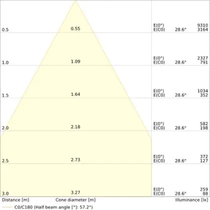 Beispiel: Wird eine Lampe mit einem Abstrahlwinkel von 60 Grad an der Decke (2,5 m Höhe) angebracht, erzeugt sie einen Lichtkegel von 2,9 Metern Durchmesser. Hat die Lampe hingegen einen Abstrahlwinkel von 120 Grad, beträgt der Lichtkegel 8,7 Meter im Durchmesser. |