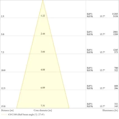 Beispiel: Wird eine Lampe mit einem Abstrahlwinkel von 60 Grad an der Decke (2,5 m Höhe) angebracht, erzeugt sie einen Lichtkegel von 2,9 Metern Durchmesser. Hat die Lampe hingegen einen Abstrahlwinkel von 120 Grad, beträgt der Lichtkegel 8,7 Meter im Durchmesser. |