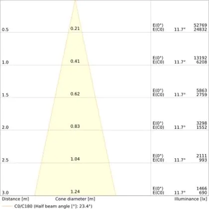 Beispiel: Wird eine Lampe mit einem Abstrahlwinkel von 60 Grad an der Decke (2,5 m Höhe) angebracht, erzeugt sie einen Lichtkegel von 2,9 Metern Durchmesser. Hat die Lampe hingegen einen Abstrahlwinkel von 120 Grad, beträgt der Lichtkegel 8,7 Meter im Durchmesser. |