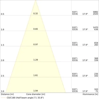 Beispiel: Wird eine Lampe mit einem Abstrahlwinkel von 60 Grad an der Decke (2,5 m Höhe) angebracht, erzeugt sie einen Lichtkegel von 2,9 Metern Durchmesser. Hat die Lampe hingegen einen Abstrahlwinkel von 120 Grad, beträgt der Lichtkegel 8,7 Meter im Durchmesser. |