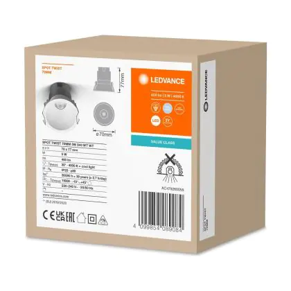 Aufgrund des geringen Energieverbrauchs von nur 5W sparen Sie mit dem LED-Einbaustrahler von Ledvance bis zu 80 % Ihrer Energie - sowie Instandhaltungskosten gegenüber einem herkömmlichen Halogenstrahler.