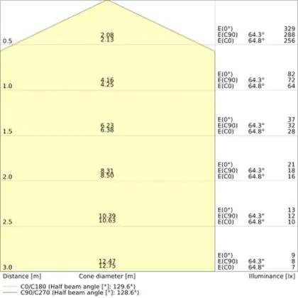 Beispiel: Wird eine Lampe mit einem Abstrahlwinkel von 60 Grad an der Decke (2,5 m Höhe) angebracht, erzeugt sie einen Lichtkegel von 2,9 Metern Durchmesser. Hat die Lampe hingegen einen Abstrahlwinkel von 120 Grad, beträgt der Lichtkegel 8,7 Meter im Durchmesser. |