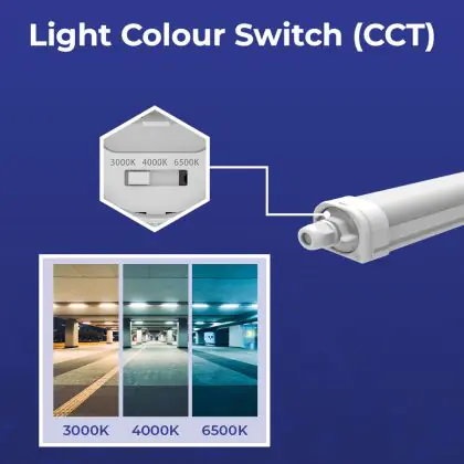 Die LED-Feuchtraumleuchte kommt mit der Farbtemperatur 3000K - 4000K - 6500K CCT daher. Als Faustregel gilt: Je niedriger der Kelvinwert, desto gemütlicher wirkt das Licht.