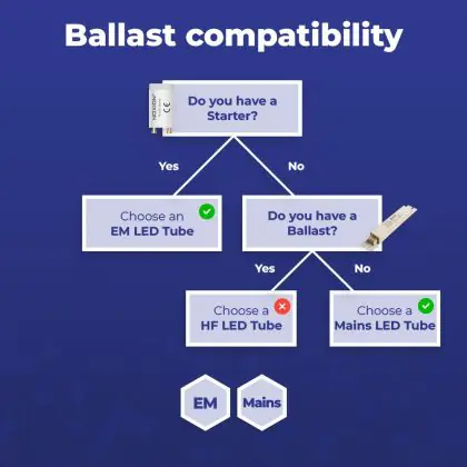 Sie benötigen einen LED-Starter, wenn die Leuchtstofflampen in Ihrer aktuellen Leuchte ebenfalls einen Starter haben. In diesem Fall besitzen Sie eine Leuchte mit einem herkömmlichen Vorschaltgerät (EM). Ein LED-Starter ersetzt Ihren aktuellen Starter und sorgt dafür, dass eine LED-Röhre funktioniert.
