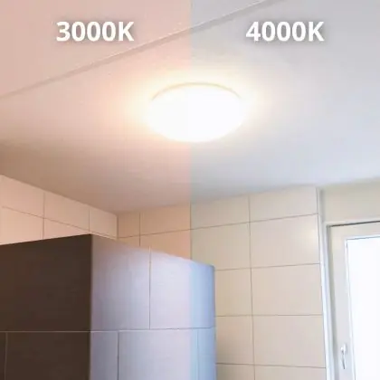 Die LED-Feuchtraumleuchte kommt mit der Farbtemperatur 3000K - Warmweiß daher. Als Faustregel gilt: Je niedriger der Kelvinwert, desto gemütlicher wirkt das Licht.