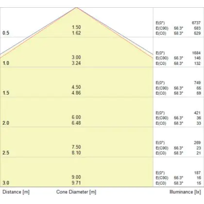 Beispiel: Wird eine Lampe mit einem Abstrahlwinkel von 60 Grad an der Decke (2,5 m Höhe) angebracht, erzeugt sie einen Lichtkegel von 2,9 Metern Durchmesser. Hat die Lampe hingegen einen Abstrahlwinkel von 120 Grad, beträgt der Lichtkegel 8,7 Meter im Durchmesser. |