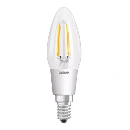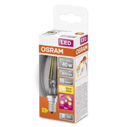 Die Osram Superstar Classic LED E14 Kerze Fadenlampe Klar 4W 470lm - 822-827 Dim To Warm | Dimmbar - Ersatz Für 40W ist eine effiziente E14 LED-Lampe mit Retrodesign und der perfekte Ersatz für Ihre konventionellen 40W Lampen mit E14. Zudem strahlt sie Licht in der Farbtemperatur 2700K - Extra Warmweiß aus und punktet durch eine lange Lebensdauer.