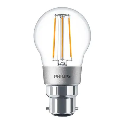 Die Philips Classic LED Lustre B22 Kugel Fadenlampe Klar 4.5W 470lm - 827 Extra Warmweiß | Dimmbar - Ersatz für 40W ist eine effiziente B22 (Bajonettsockel) LED-Lampe mit Retrodesign und der perfekte Ersatz für Ihre konventionellen 40W Lampen mit B22 (Bajonettsockel). Zudem strahlt sie Licht in der Farbtemperatur 2700K - Extra Warmweiß aus und punktet durch eine lange Lebensdauer.