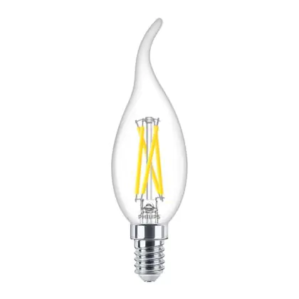 Die Philips MASTER LED E14 Gebogen-tip Kerze Fadenlampe Klar 2.5W 340lm - 922-927 Dim To Warm | Höchste Farbwiedergabe - Dimmbar - Ersatz Für 25W ist eine effiziente E14 LED-Lampe mit Retrodesign und der perfekte Ersatz für Ihre konventionellen 25W Lampen mit E14. Zudem strahlt sie Licht in der Farbtemperatur 2200K - 2700K Dim To Warm aus und punktet durch eine lange Lebensdauer.