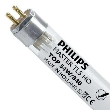 Die Philips MASTER TL5 HO TOP 54W - 840 Kaltweiß | 145cm ist eine Leuchtstoffröhre mit einer Länge von 1450 mm. Das Produkt hat einen Durchmesser von 17 mm. Die Röhre strahlt Licht in der Farbtemperatur 4000K - Kaltweiß aus und punktet durch eine lange Lebensdauer.