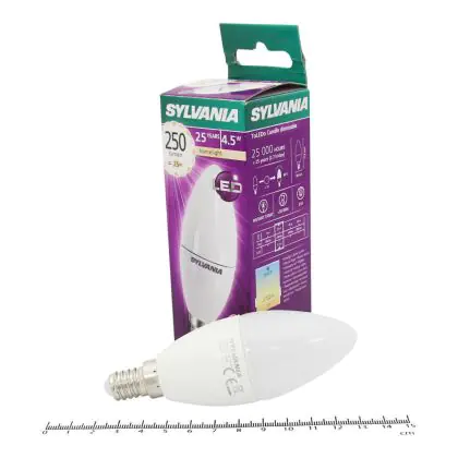 Die Sylvania ToLEDo E14 Kerze Matt 4.5W 250lm - 827 Extra Warmweiß | Dimmbar - Ersatz für 40W ist eine effiziente E14 LED-Lampe und der perfekte Ersatz für Ihre konventionellen 40W Lampen mit E14-Sockel. Zudem strahlt sie Licht in der Farbtemperatur 2700K - Extra Warmweiß aus und punktet durch eine lange Lebensdauer.